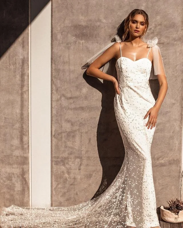 Pairing oversized bows with luminous hail-spot tulle, this delicate design by Love You More Bridal is equal parts feminine and playful. Featuring a flattering sweetheart neckline on a fitted bodice, atop a fit and flare skirt, the ‘Oh So Pretty’ gown is just that.