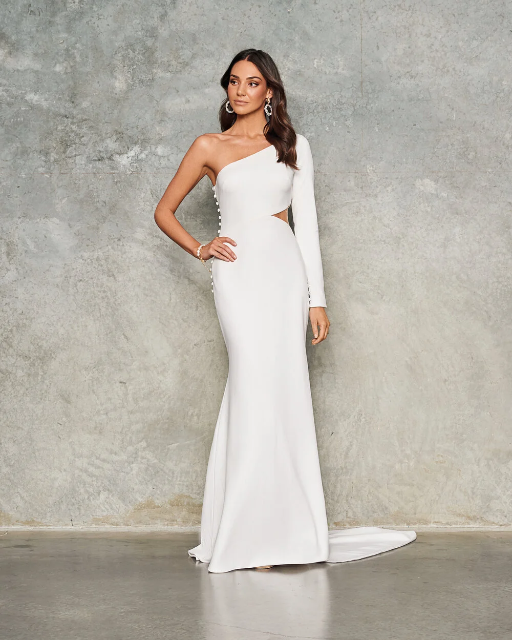 Boasting a one-shoulder silhouette with a long-fitted sleeve, the Bowie Gown is the quintessential statement gown for the modern woman. Elegantly balanced with a waist cut out, a sleek crepe fabrication and delicate fabric covered buttons, the Bowie Gown will undoubtedly impress the most discerning of brides.