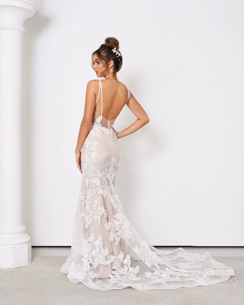 Reimagining Ivory Lace, the Bonita Gown is a femininely modern look for the bride that has her heart set on an all over lace look. Featuring a daring skirt split, a stunning v-neckline and delicate rose motif sleeves, Bonita gown is an obvious choice for luxury at an affordable price point.