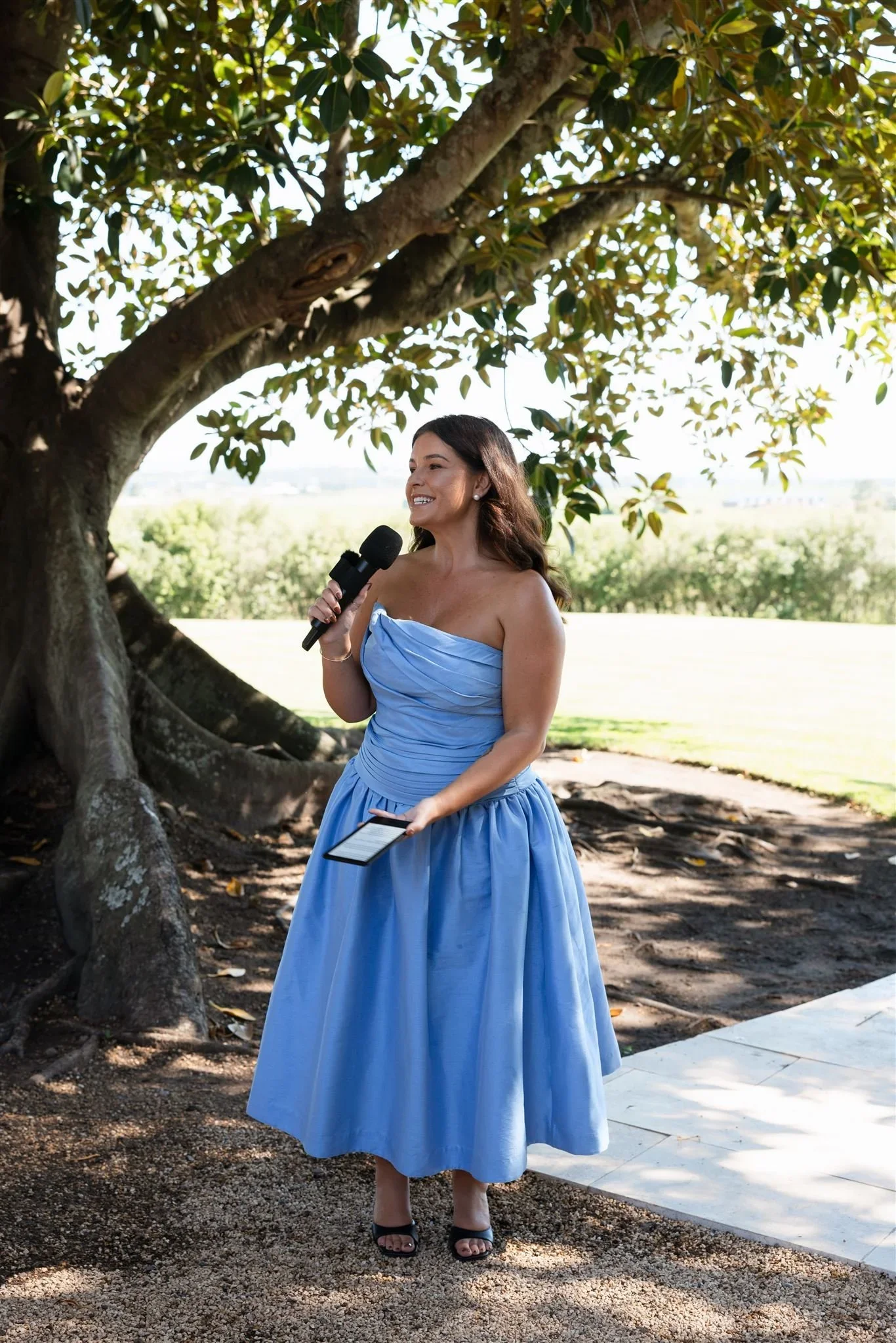 First, I went in to see the bride. She – was – thrilled. The shine of her smile set me on fire, and immediately, I felt my energy rocket to the MOON. We had a chat, and I wandered out to the ceremony spot. The DJ had just finished setting up, so I went to introduce myself and run through cues. I saw his microphone resting on the deck and explained the situation with my PA. This guy, may I say, did not know me from a bar of soap. Yet, he smiled, with such kind eyes, and handed me the microphone without a second thought.